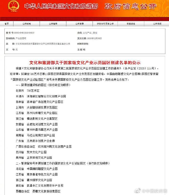 文旅部公示国家级文化产业示范园区创建名单